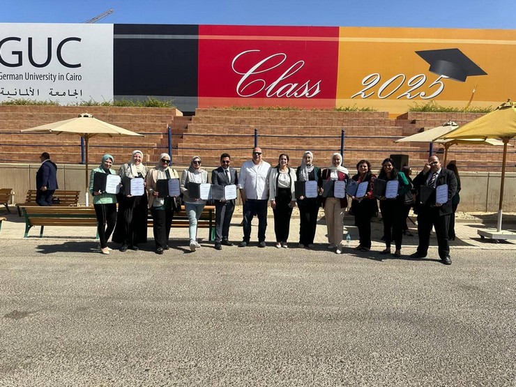 The ceremony, held at the German University in Cairo, witnessed the distribution of certificates for the joint training diploma between the Arab Contractors Institute for Construction Engineering and Management Technology and the German University, specifically designed for project managers and construction managers at the Arab Contractors Company, in the specializations of (civil, architecture, electricity, and mechanics). The ceremony was attended by Dr. Heba Adel and Dr. Mohamed Taha Abdel Hadi - Manager of the Continuing Education Center at the German University in Cairo.