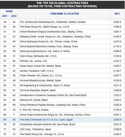 تقدم ترتيب شركة المقاولون العرب الوارد بمجلة ENR الامريكية لعام 2011 ...
