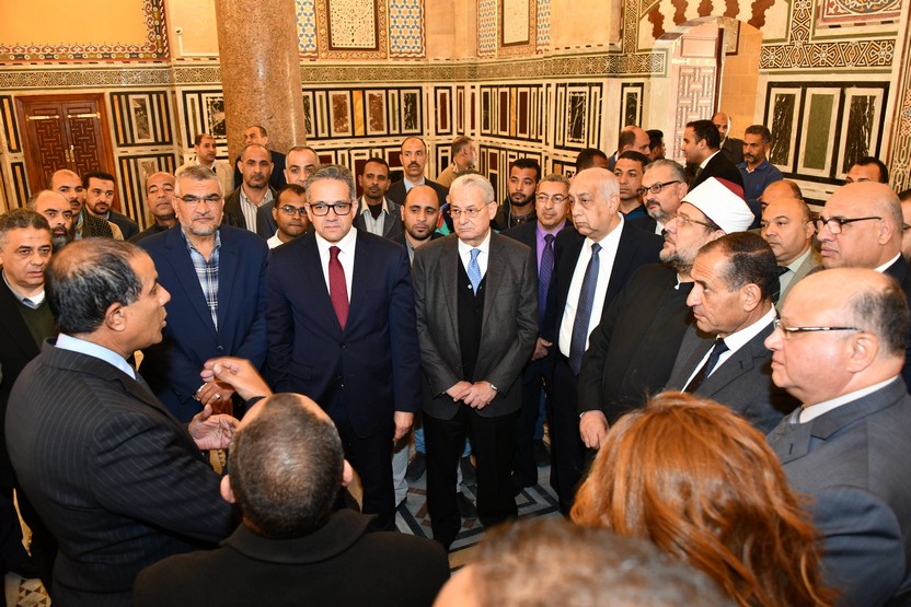 تفقد الدكتور مختار جمعة وزير الأوقاف والدكتور خالد العناني وزير السياحة والآثار واللواء خالد عبد العال محافظ القاهرة يوم الأحد 5 يناير أعمال ترميم مسجد الفتح الملحق بقصر عابدين وذلك في حضور الدكتور مصطفي وزيري أمين المجلس الأعلى للآثار والمهندس محسن صلاح رئيس مجلس إدارة شركة المقاولون العرب المنفذة لأعمال الترميم، والعميد هشام سمير مساعد وزير السياحة والآثار للشئون الهندسية والدكتور جمال مصطفي رئيس قطاع الأثار الإسلامية والقبطية واليهودية والمهندس وعدالله أبوالعلا رئيس قطاع المشروعات بالوزارة، والمهندس إمام عفيفي نائب رئيس مجلس إدارة المقاولون العرب والمهندس طارق خضر رئيس قطاع التشييد والأعمال التخصصية. والذي أوضح أن أعمال الترميم قامت بتنفيذها إدارة صيانة القصور بالتعاون مع عدد من الإدارات التخصصية بحوالي 16 مليون جنيه، مشيراً أنه تم الانتهاء من الأعمال الداخلية للمسجد والتي تضمنت الأرضيات الرخامية بصحن المسجد، وترميم وتنظيف التجاليد الرخامية للحوائط، وأعمال تنظيف وترميم المنبر والمحراب وكافة الاعمدة الرخامية والجرانيتية بالمسجد، والقباب والقباوات من الداخل وانهاء الأعمال الزخرفية بها، بالإضافة إلى تركيب اجهزة النظام الصوتي ووحدات الاضاءة الداخلية وكاميرات المراقبة، إلى جانب الاعمال التي تمت بخارج المسجد، من تنظيف احجار الواجهات والمئذنة، والقباب النحاسية بالأسطح، وأعمال عزل بلاط أرضيات الأسطح، وأعمال تركيب أرضيات حجرية بالموقع العام داخل المسجد وجهة المدخل الرئيسي، واستكمال أعمال الإضاءة الخارجية. جدير بالذكر أن المسجد يتكون من مربع أساسي تقوم عليه قبة وهو مكان الصلاة. وقد ألحق بهذا المربع ثلاث مجموعات من المباني من جهته الغربية والجنوبية وكذا الشرقية، وكل هذه الملحقات بها أروقة ودهاليز وغرف تقوم بخدمة أغراض المسجد المتعددة، وتوجد الواجهة الرئيسية للمسجد في الجهة الغربية منه وهى تشرف على حديقة قصر عابدين ويبلغ ارتفاعها 15.70 متر ويتوسط الواجهة الغربية المدخل الملكي للمسجد وتقع مئذنة الجامع في الركن الجنوبي الشرقي للجامع.